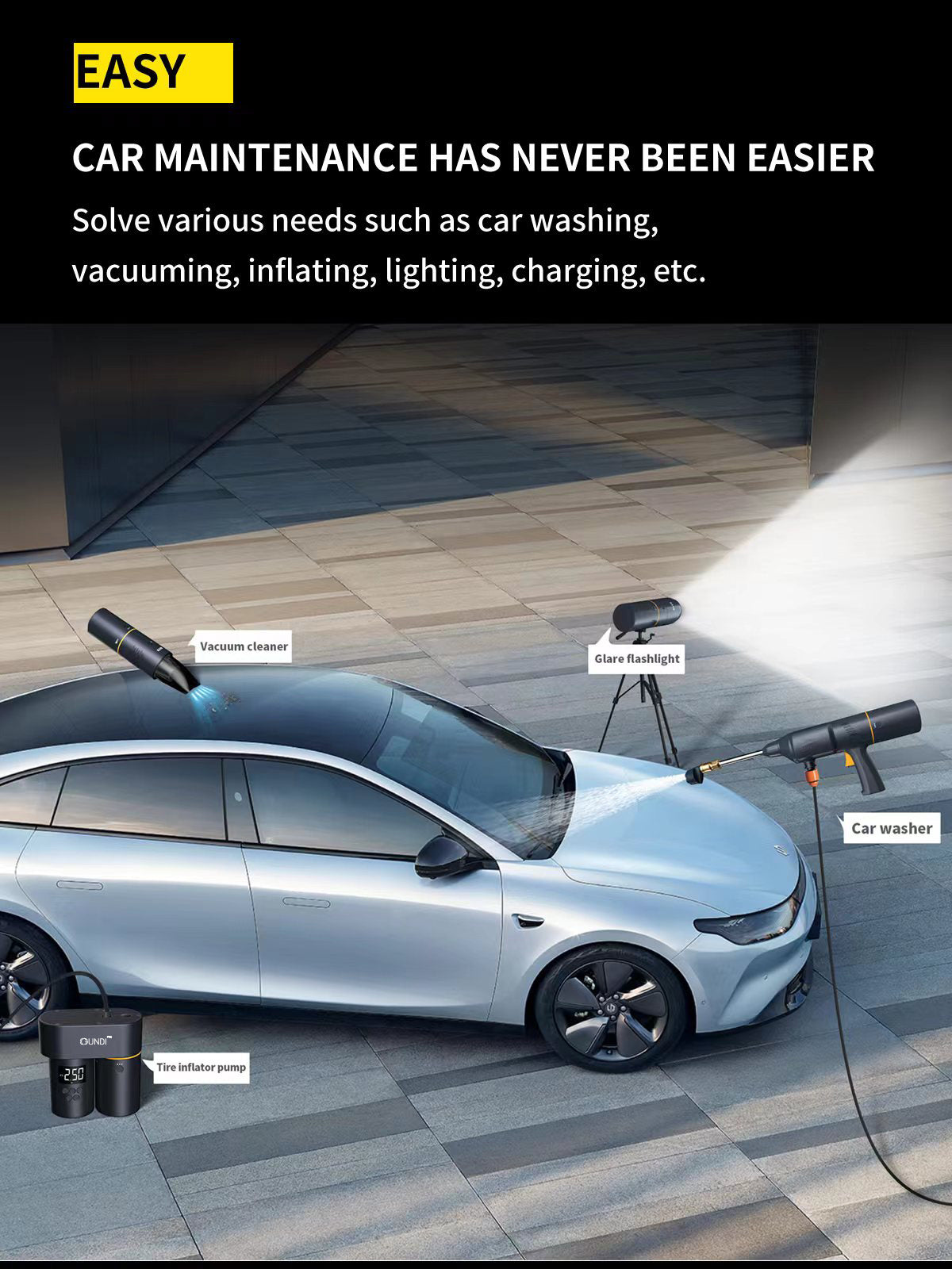 A power bank supports 5 other units: a Car Washer, a Flashlight, a Vacuum Cleaner, a Tire Inflator Pump, a Phone Stent Holder.